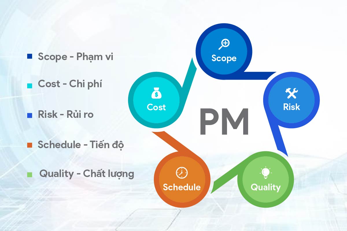 Một PM xuất sắc là người dẫn dắt dự án thông qua sự cân bằng của cả 5 domain: Làm đúng việc – Đúng thời hạn – Đúng ngân sách – Đạt chất lượng – Chủ động rủi ro